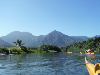 Bill and I were excited to paddle on the Hanalei River because we were enchanted by it the first time we stood on its banks. The first night we arrived, we headed down to Hanalei from Princeville, and dined at the Hanalei Dolphin Restaurant, which sits on the River. Since it didn’t open for dinner for another half hour, we ordered a glass of wine and sat by the water. The first thing we noticed about the Hanalei is that it had beautiful orange flower blossoms strewn across its surface, dropped there by the trees that lined its banks. It turns out that the flower we saw is a type of hibiscus (hibiscus tiliaceus) or hau flowers, as the locals call them. It has five creped petals that are yellow at first and then turn orange as they open and develop. It was dreamlike to see them floating down the river that evening and even more dreamlike to paddle through them in an outrigger.